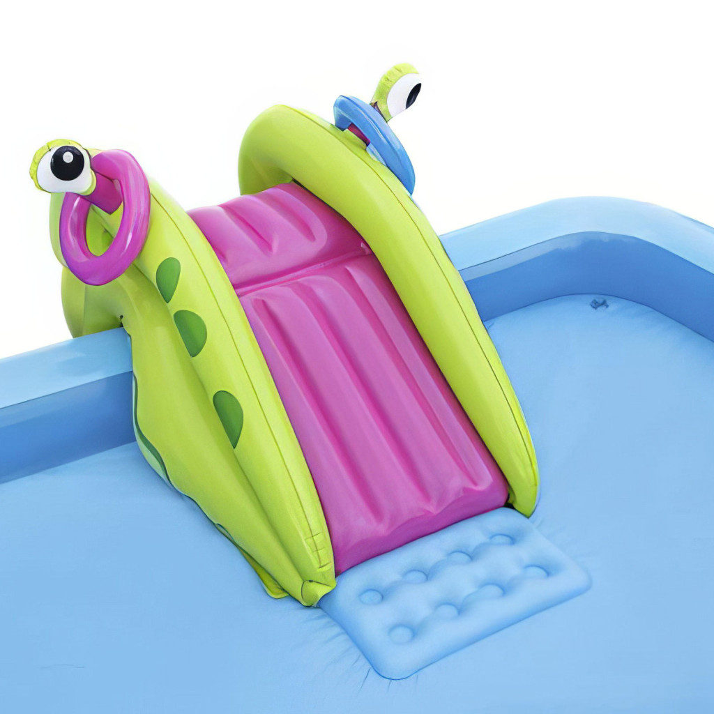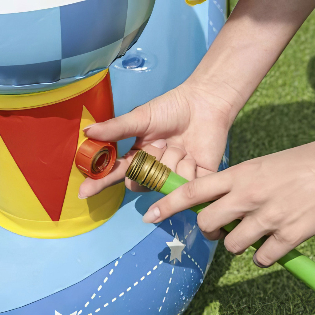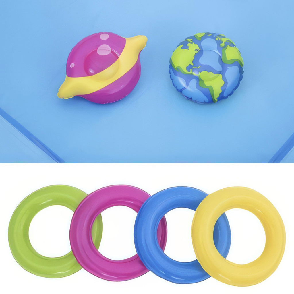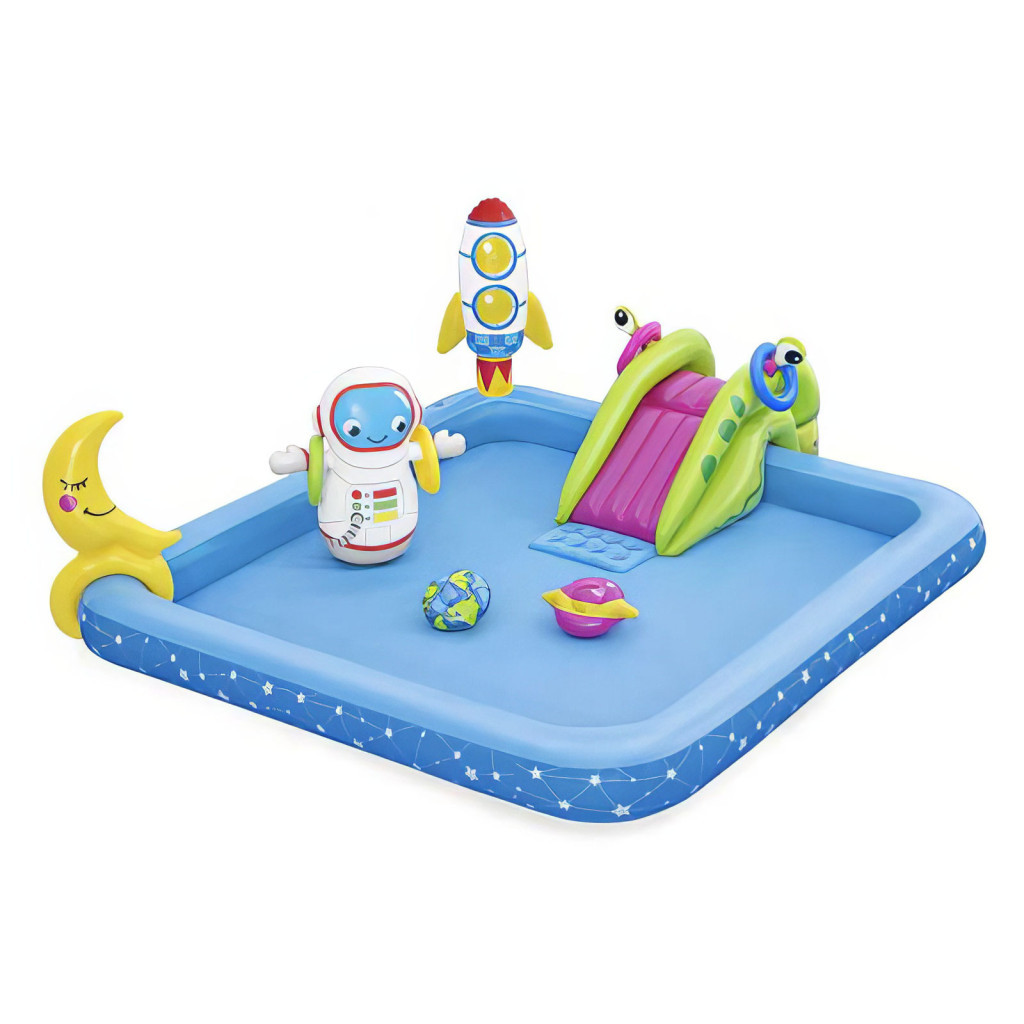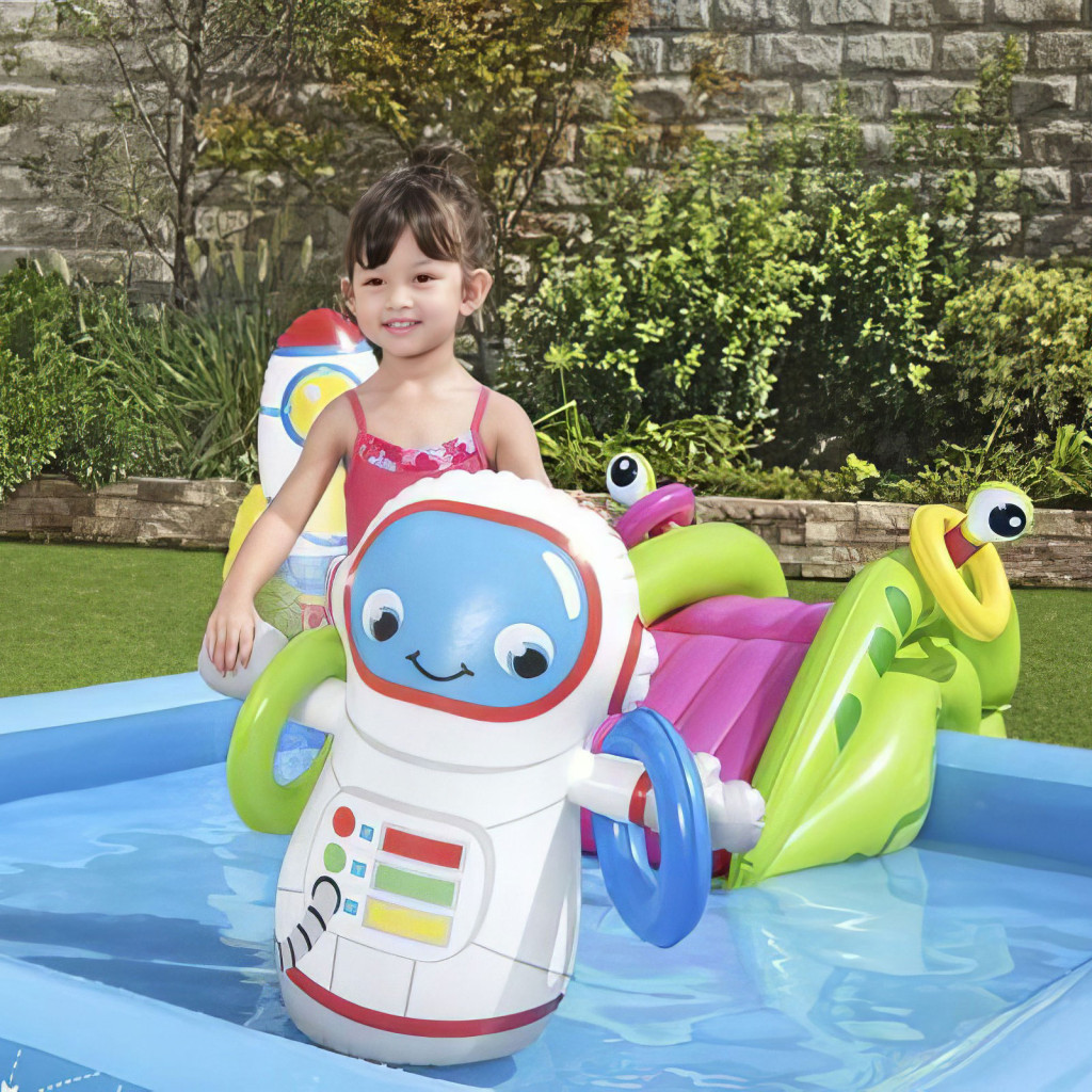 Ez a vizi játszótér tökéletes választás minden kisgyermekes család részére! A játszótér részét képezi többek között medence, csúszda, rakéta, űrhajós, felfújható karikák. A felfújható játszótér biztonságosan használható, de szülői felügyelet javasolt. A gyermekek gyakorolhatják célóképességüket, dobókészségüket a felfújható gyűrűkkel történő célbadobással. A puha fallal körülvett medence PVC-ből készült, ellenáll a különféle sérüléseknek.