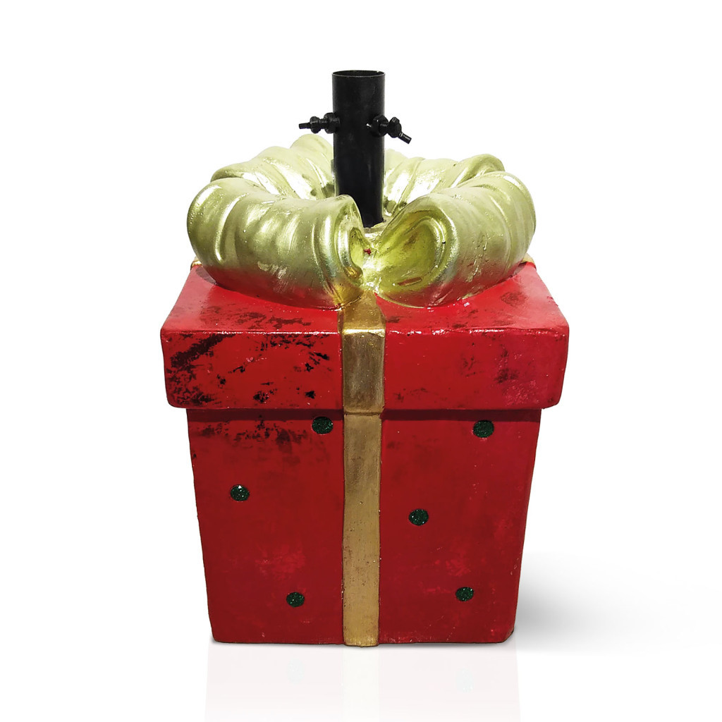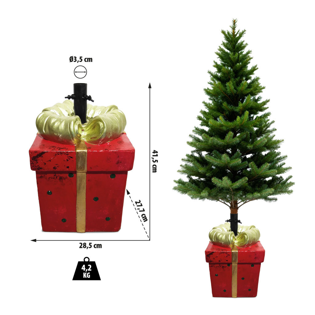 Ez az ajándékcsomag formájú karácsonyfa talp nemcsak praktikus, de dekoratív eleme is lehet a karácsonyfának. A piros színű, arany masnival díszített csomagolás élethű ajándék benyomását kelti, miközben stabilan tartja a karácsonyfát. A műkőből készült talp erős tartást biztosít nagyobb méretű fák esetén is.