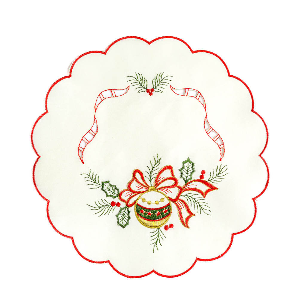 Ez a klasszikus, hímzett karácsonyi asztalterítő tökéletes választás az ünnepi hangulat megteremtéséhez. A kerek forma, a piros szegély és a részletgazdag hímzett minták – csengő, gyertya, gömbdísz és fagyöngy – elegáns megjelenést kölcsönöznek bármely asztalnak. A 29 cm átmérőjű terítő ideális asztalokra, komódokra vagy dekorációs tálak alá.