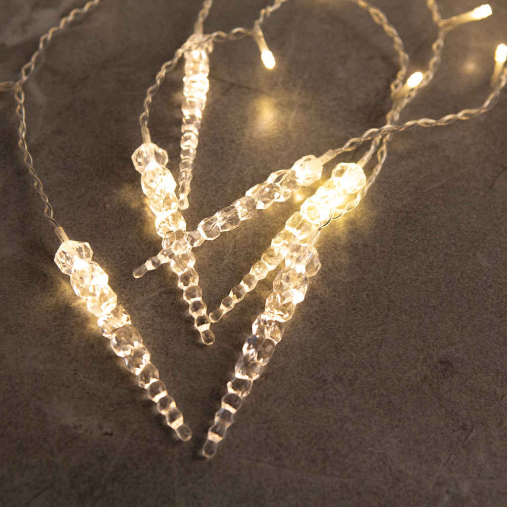 Dobja fel otthona ablakait ezzel a melegfehér LED-es fényfüggönnyel. A 180 db LED-ből álló függöny tápellátása hálózati áramforrásról történik és az IP44 védelemnek köszönhetően akár kültéren is használható. Az egyes lelógó szálak hossza és LED száma változó, a szálak végén átlátszó jégcsapok találhatóak. A nagy ledszámnak köszönhetően csodálatos látványt nyújt. Ideális lehet ablakok, filagóriák, erkélyek díszítésére is.