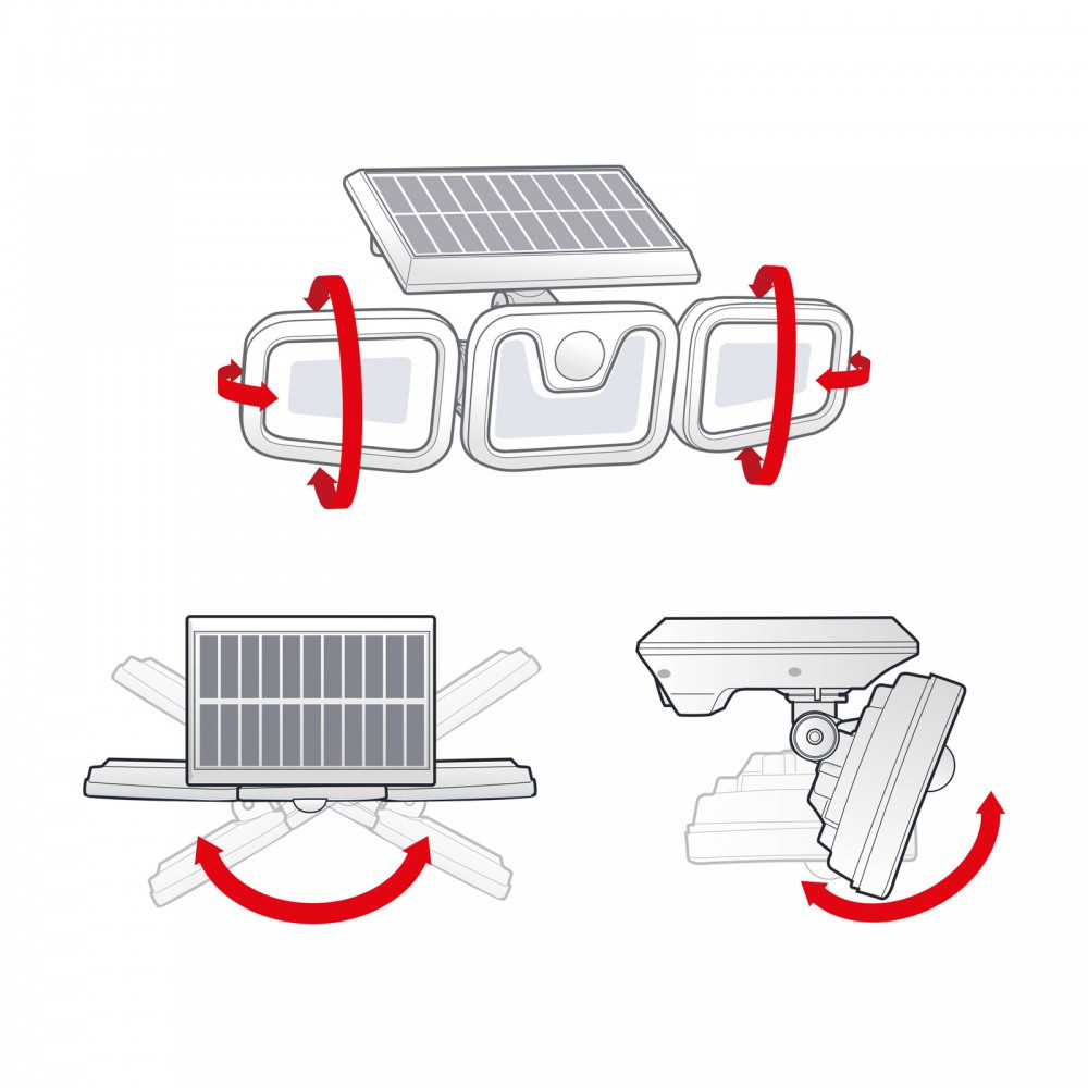 Nagyteljesítményű mozgásérzékelős fali reflektor, amely három forgatható COB LED és 1 db nagyméretű szolár egységből áll. A két tengely mentén forgatható LED-ek szabadon állíthatóak, így garantáltan minden körülmény között bevilágítják a szükséges területet. Ideális lehet teraszok, bejáratok, kocsibeállók megvilágítására. A napelemes kialakításnak köszönhetően, nincs szükség kábelezésre, villamos hálózat kiépítésére, könnyen felszerelhető a falra. Sötétben, kevés fény esetén mozgás hatására automatikusan bekapcsolja a COB LED fényforrást. A világítás ~20 mp elteltével automatikusan lekapcsol. Napközben a napelemnek köszönhetően újra feltöltődik a beépített akkumulátor.