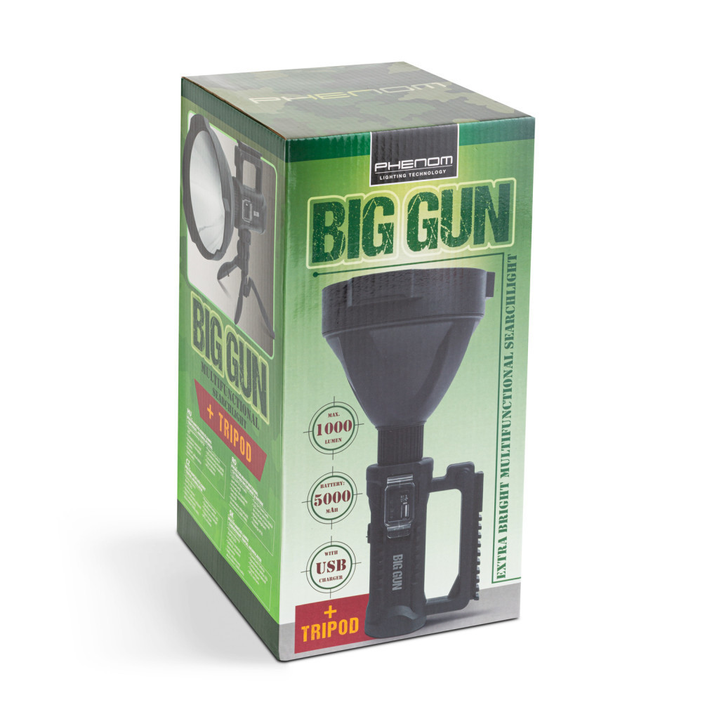 Strapabíró kialakítású, nagyméretű keresőreflektor, amely akkumulátoros működésének köszönhetően hosszantartó működést garantál. A nagyteljesítményű, extra fényerővel rendelkező, XHP50-es CREE LED, akár 500 méter szúrófényt is képes kibocsátani magából, így minden körülmények között számíthat rá. A beépített USB porton keresztül - az 5000 mAh-s akkumulátorról - lehetőség nyílik tölteni eszközeinket (például: telefon, gps, rádió, elektromos öngyújtó). A robosztus kialakítású ház IP55 védelemmel rendelkezik, így esős, párás időben is kiváló szolgálatot nyújt. A lámpa kényelmes használatát kétféle csúszásmentes fogantyú garantálja, mely közül az egyik háromlábú tripoddá is alakítható, így bárhová elhelyezve állandó fényként világítja meg a munkaterületet. Ideális felszerelése lehet túrázóknak, vadászoknak, horgászoknak, keresőcsapatoknak, biztonságiőröknek vagy akár hatóság embereinek is.