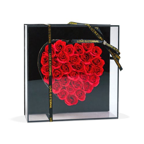 Tegye különlegessé ajándékát ezzel a stílusos és elegáns dekorációval! Ez a szív alakú műrózsakompozíció egy átlátszó díszdobozban található, amelyet „LOVE IS ETERNAL” ("a szerelem örök") feliratú fekete szalag tesz még exkluzívabbá. A termék beépített LED világítással is rendelkezik, amely kiemeli a rózsák szépségét és romantikus hangulatot teremt. Tökéletes ajándék, bár mely alkalomra, legyen szó például Valentin-napról, évfordulóról, születésnapról vagy akár karácsonyról.