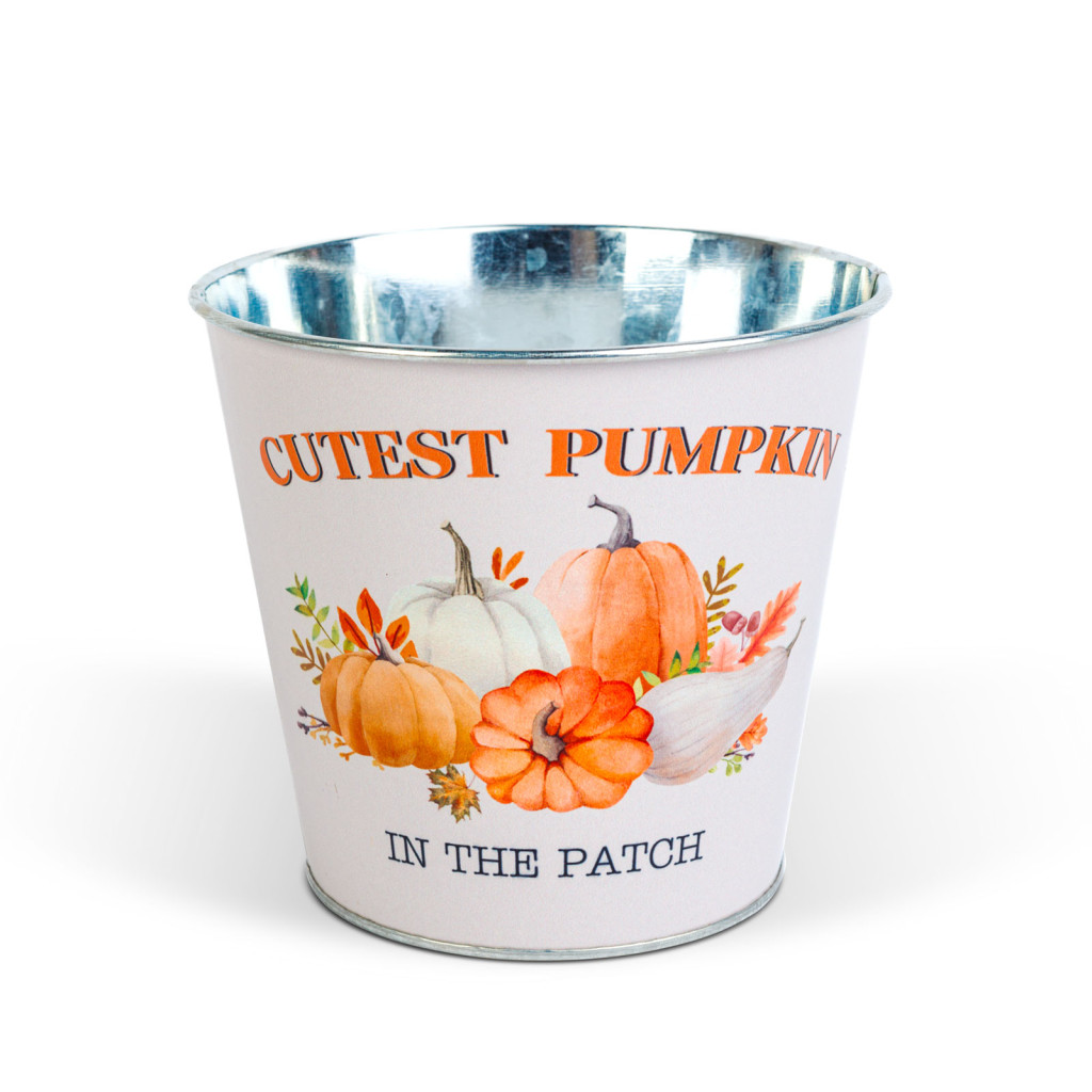 Őszi dekoráció - fém kaspó, vödör - tökös - 15 x 13,7 cm